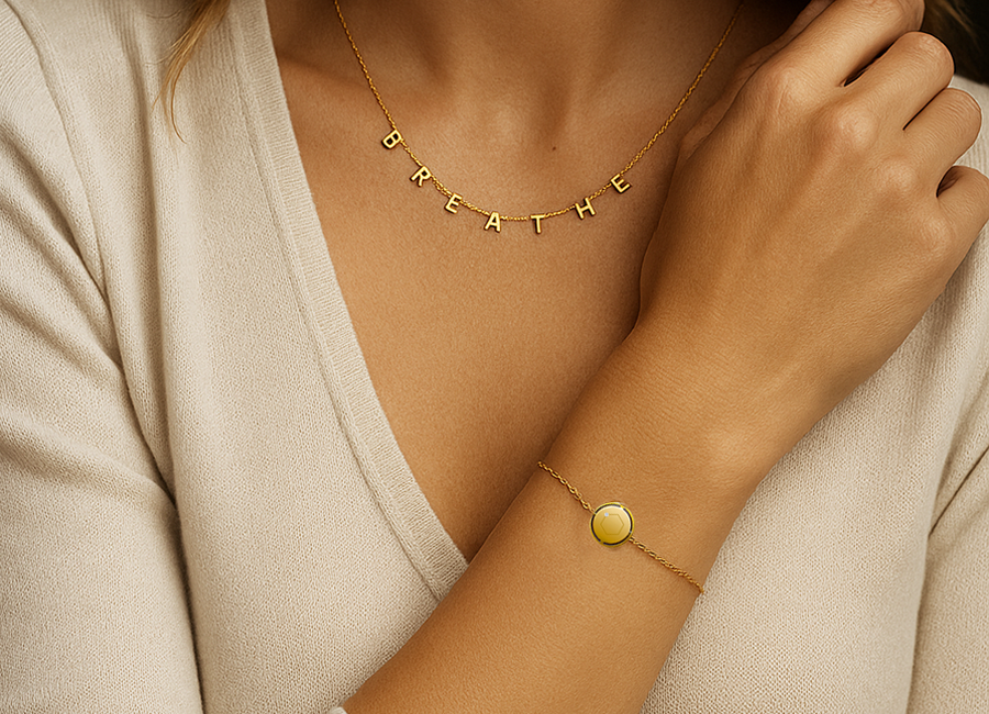 An always on reminder, a wearable cue to inhale, exhale, reset. Timeless letterforms on a fine chain that layers with everything, including your Shift.